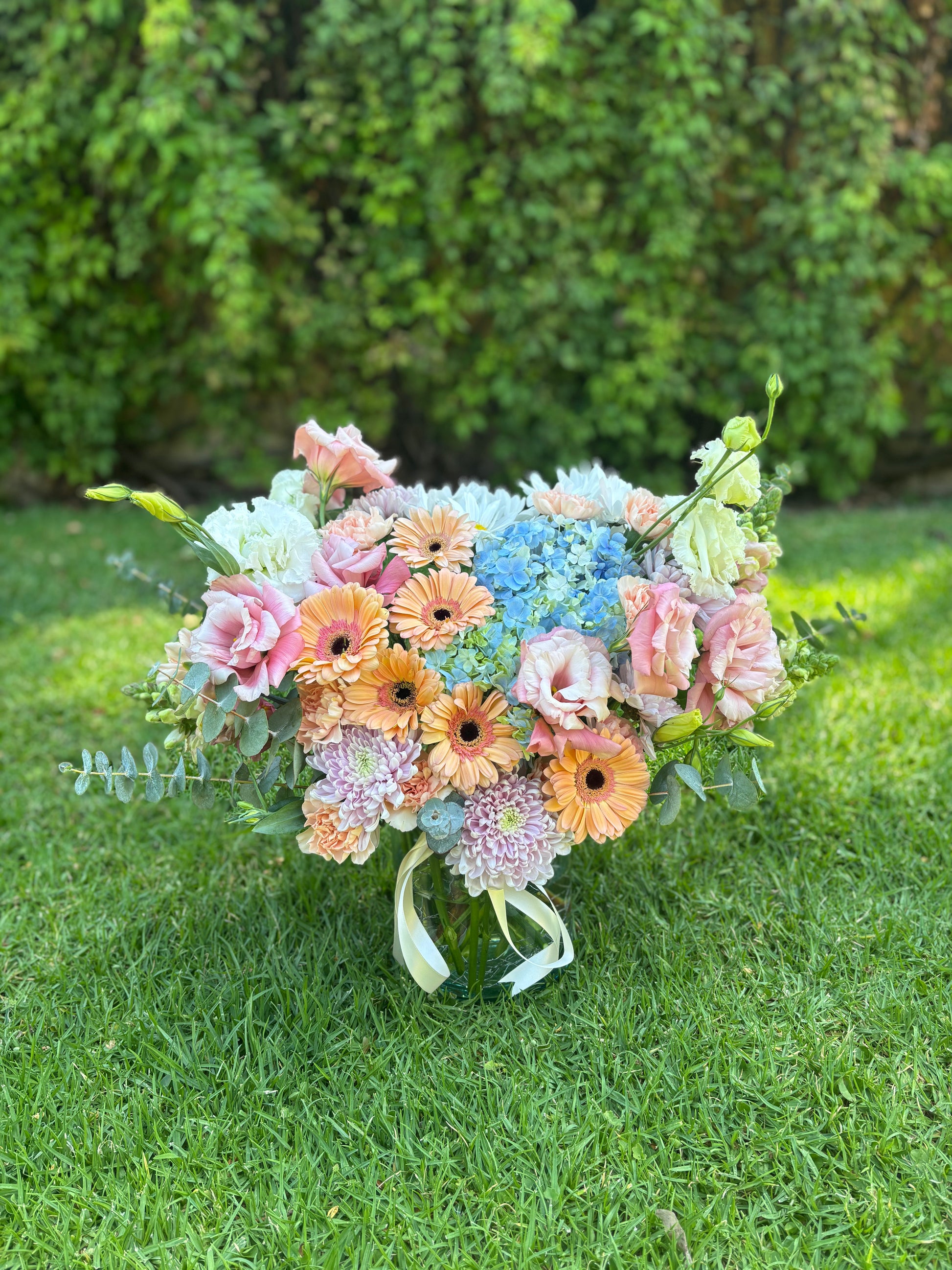 Arreglo en jarron de cristal compuesto de Gerberas salmon, 1 hortensia, Lisianthus y más!