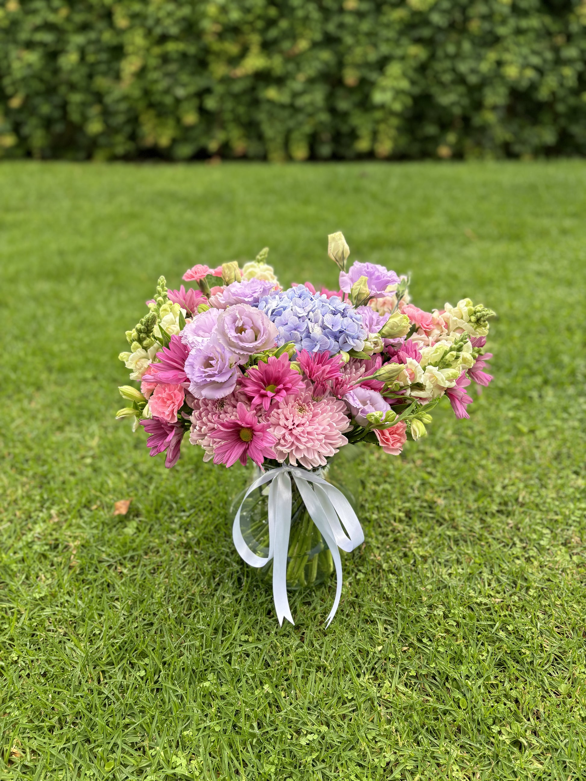 Arreglo en jarrón, tonos pasteles, compuesto de 1 Hortencia, Lisianthus, Roxanas y más!