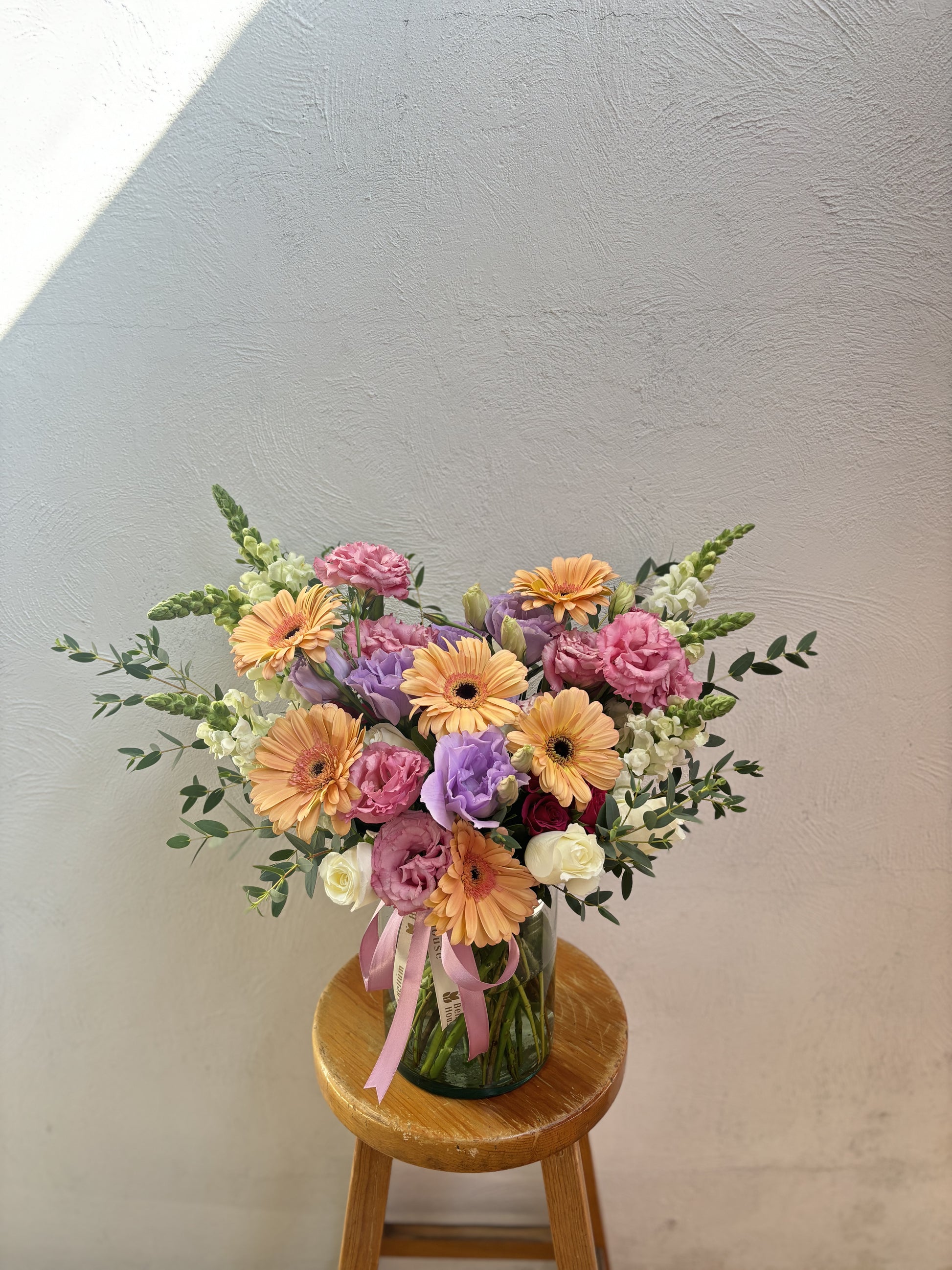 Arreglo en jarrón en tonos vibrantes, compuesto de Gerberas salmon, Perrito, Lisianthus y más!