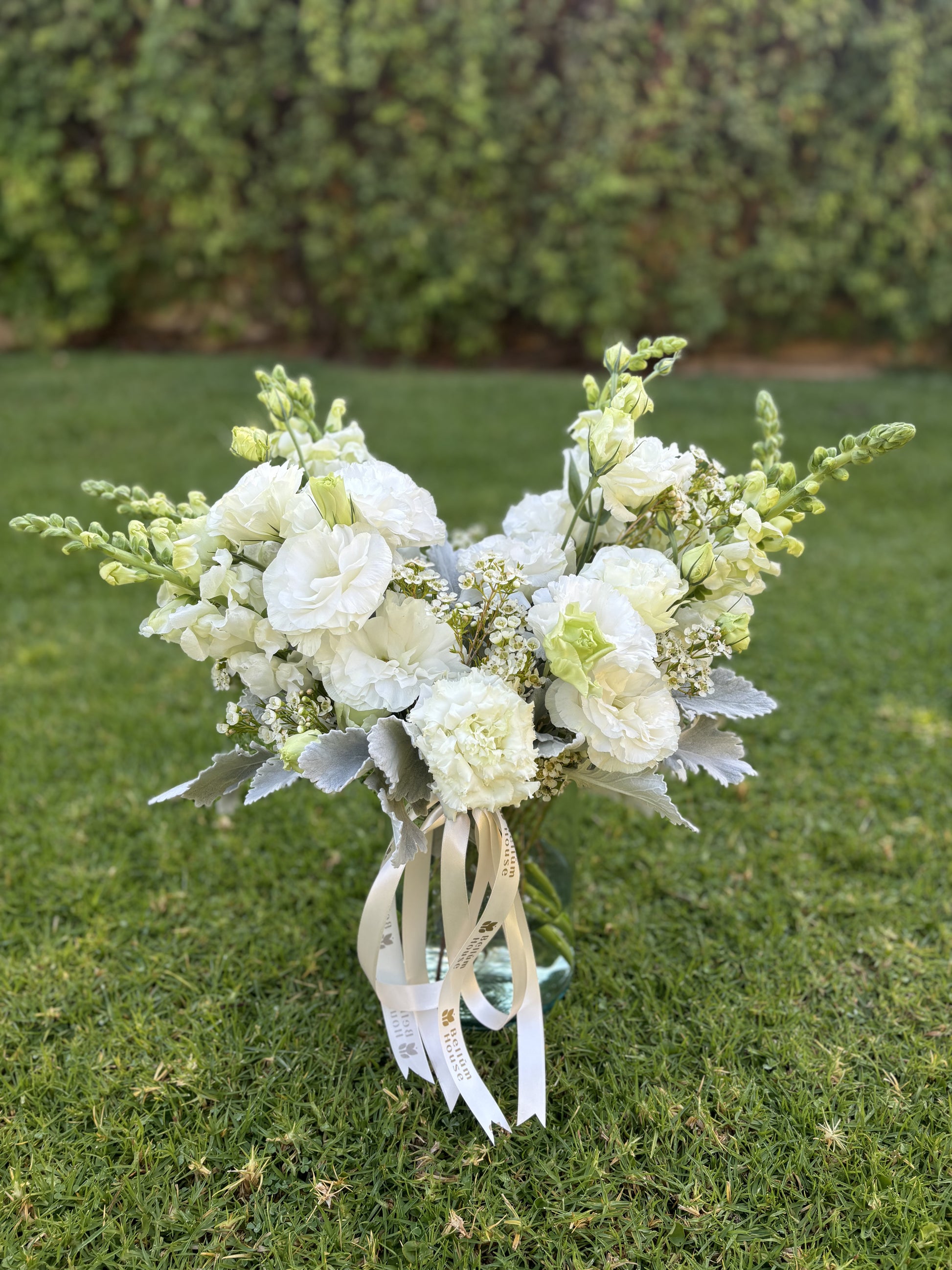 Arreglo en jarrón en tonos verdes y blancos, compuesto de Lisianthus, Perritos y más!