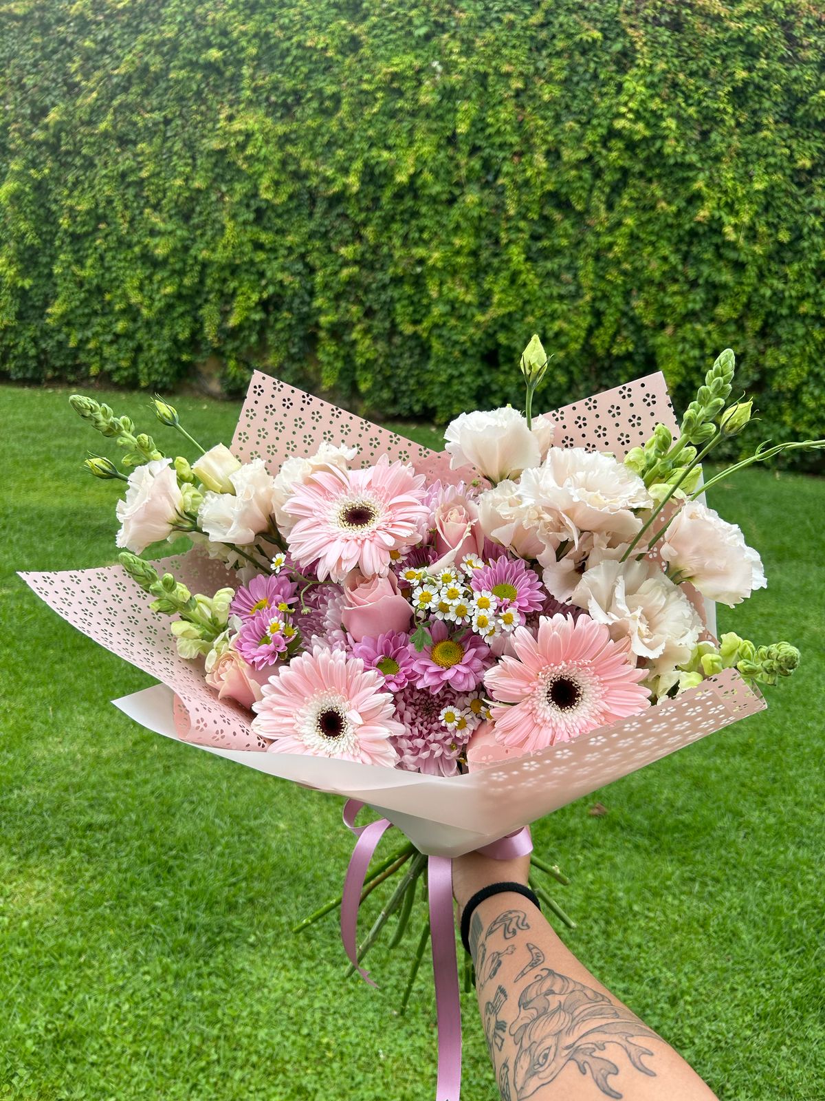 Ramo en tonos rosas pastel compuesto de Lisianthus, Gerberas y Margaritas.