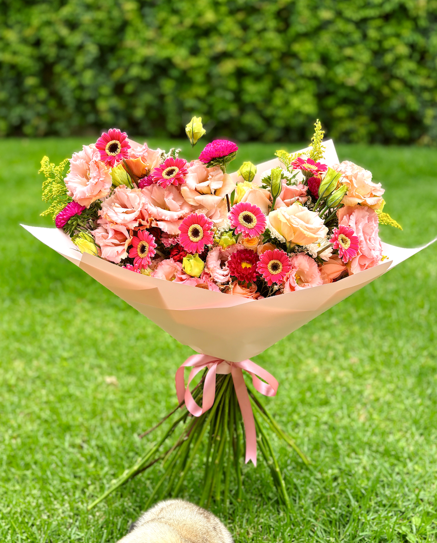 Ramo con flores premium como Mini Gerberas, Lisianthus, Rosas y más!