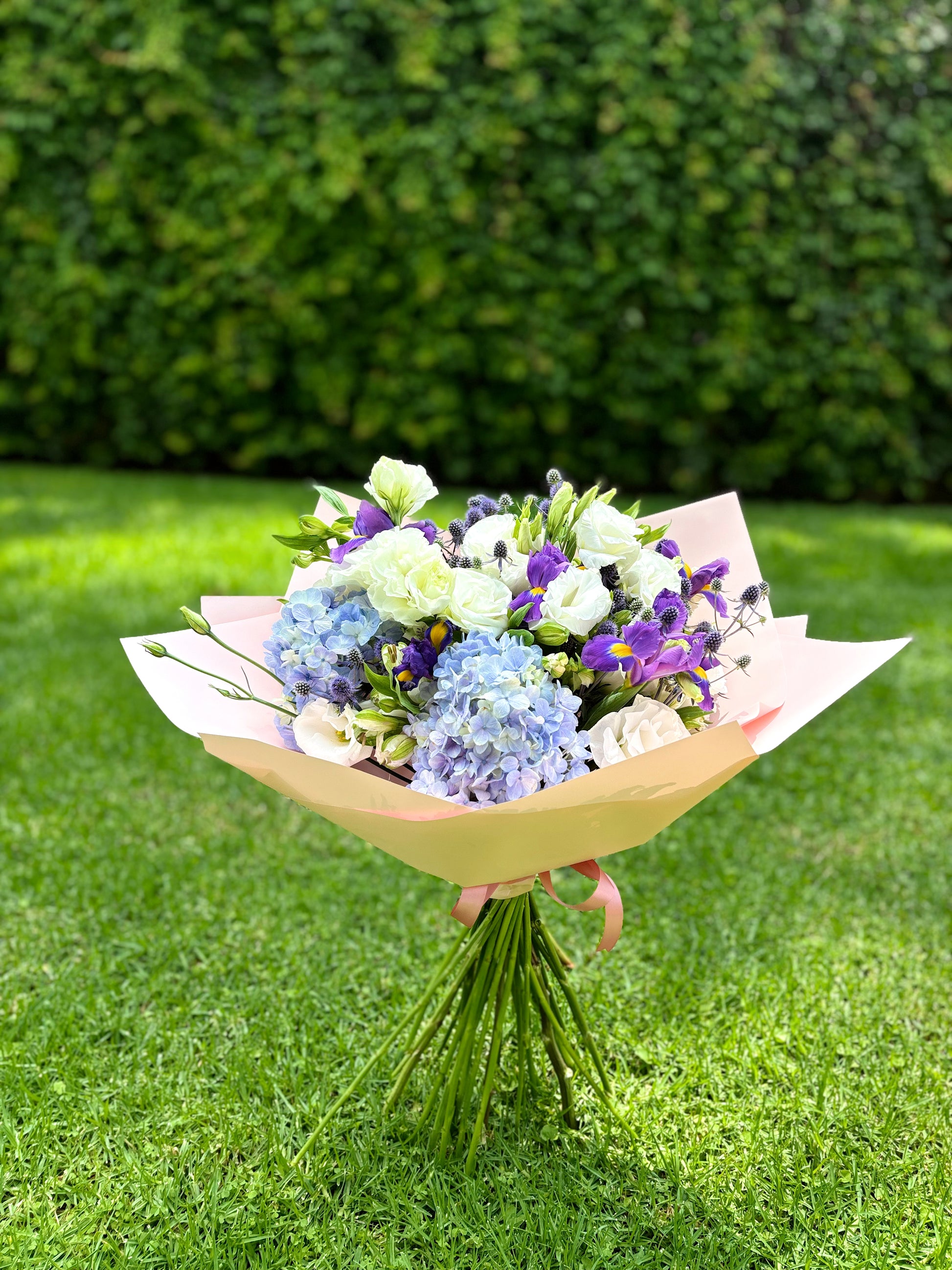 Ramo con flores premium como Iris, Lisianthus, Hortensias y más!