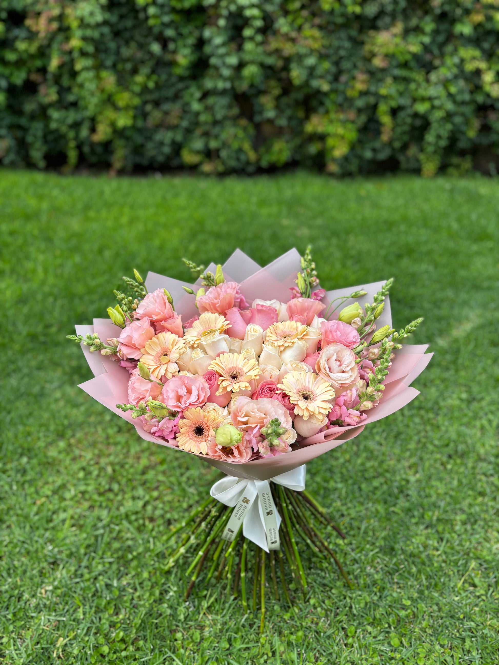 Ramo XL en tonos pasteles compuesto de 48 rosas, Lisianthus, perritos y Gerberas.