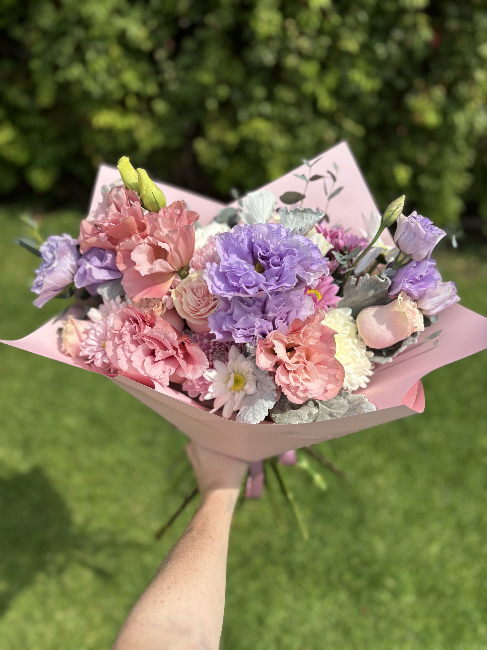 Ramo en tonos pasteles compuesto por Rosas, Roxanas, Lisianthus y más!