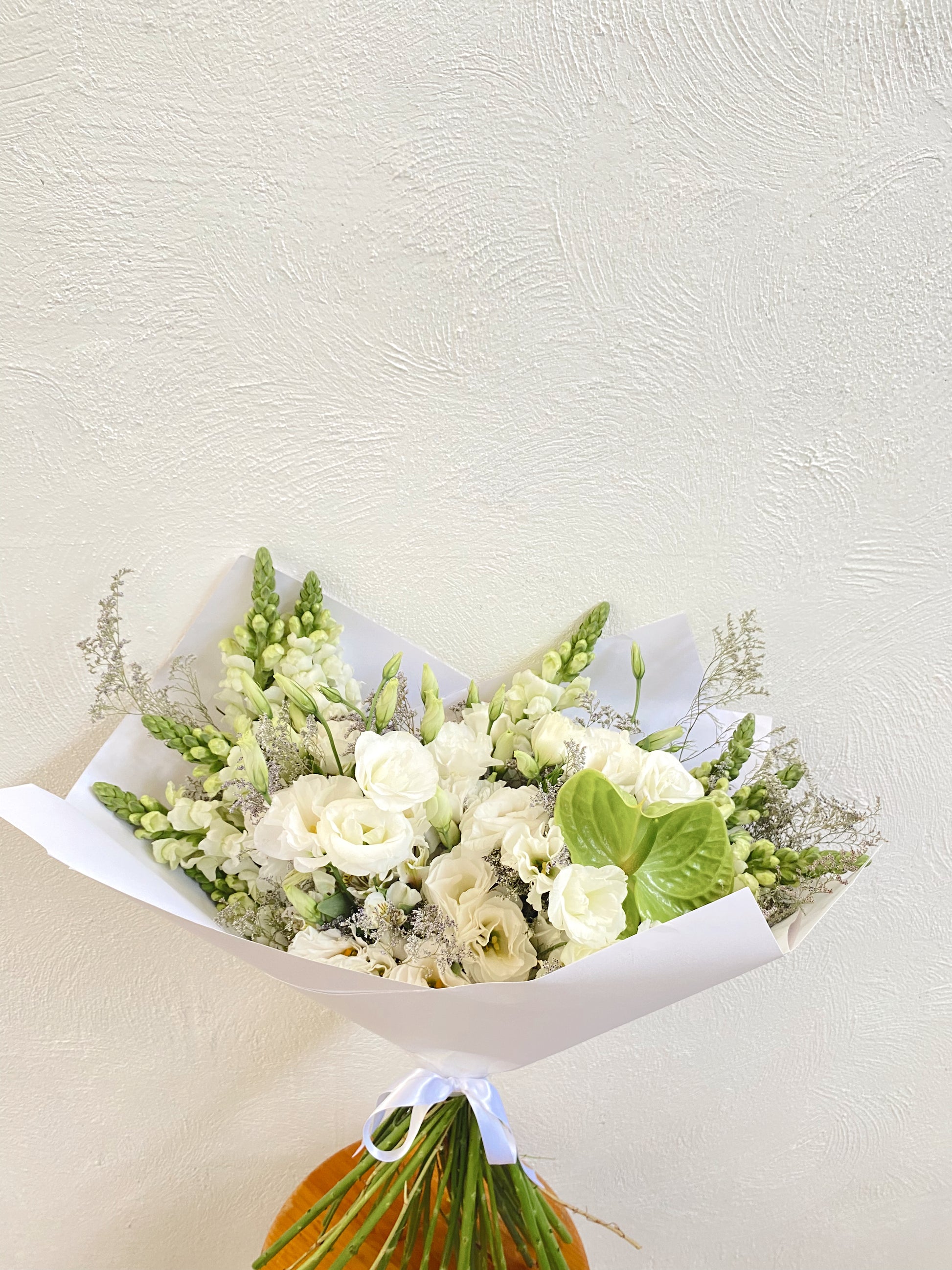Ramo con flores premium en tonos blancos y verdes compuesto por lisianthus, anturio y más!