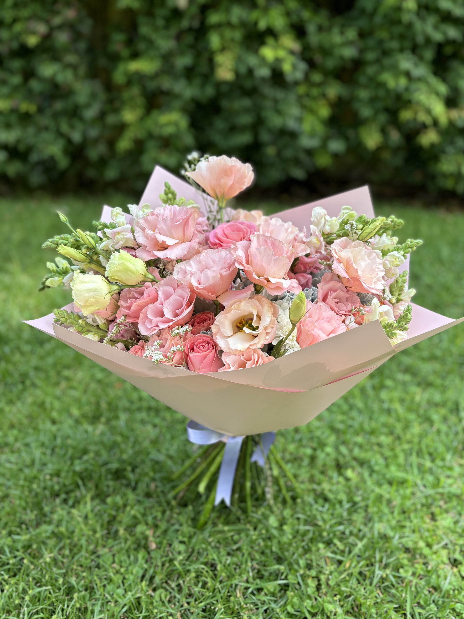 Ramo en tonos rosas compuesto de Lisianthus, Rosas y más!