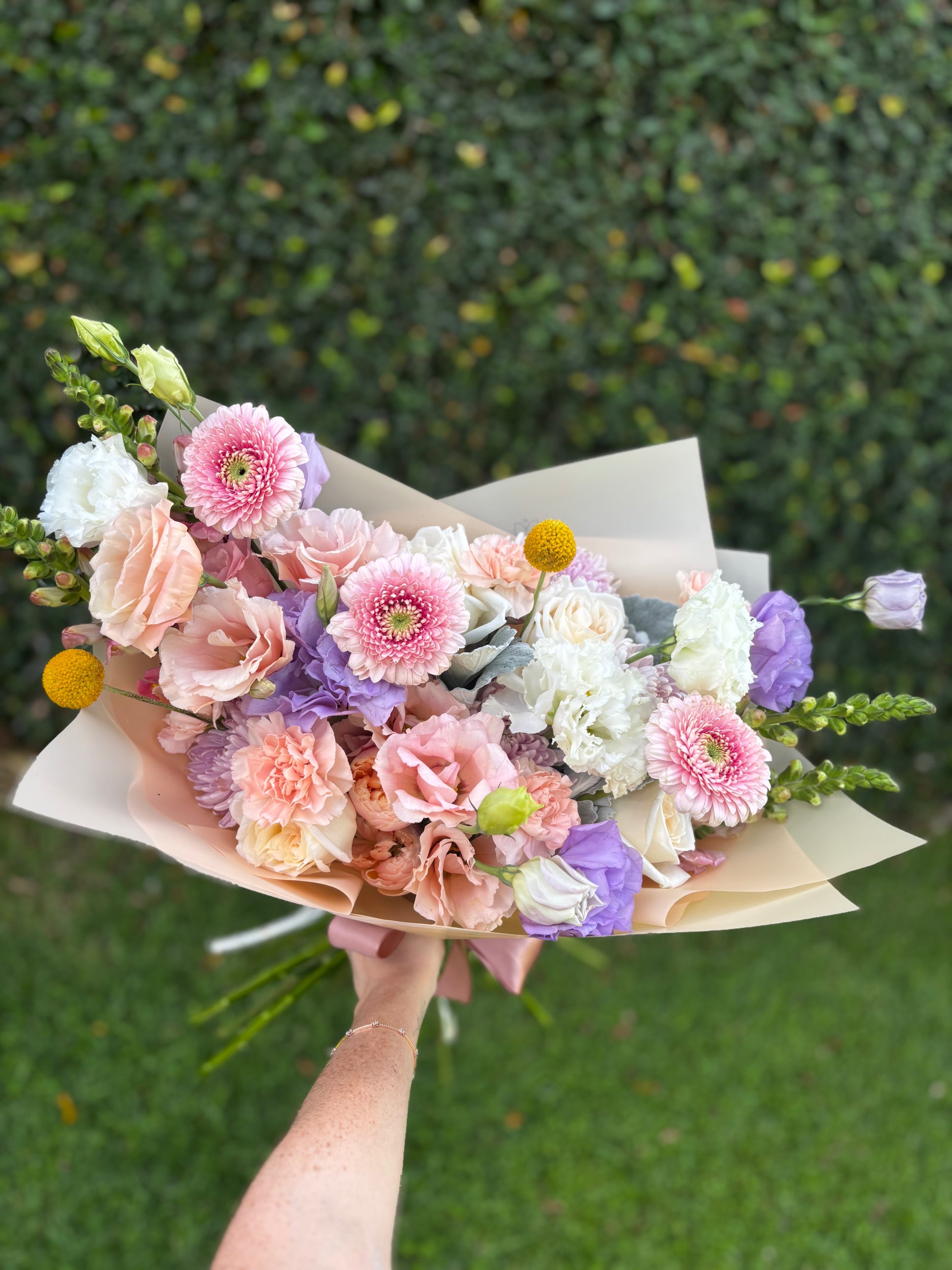 Ramo compuesto de flores premium en tonos pasteles como Gerbera japonesa, Lisianthus, Rosas y más!